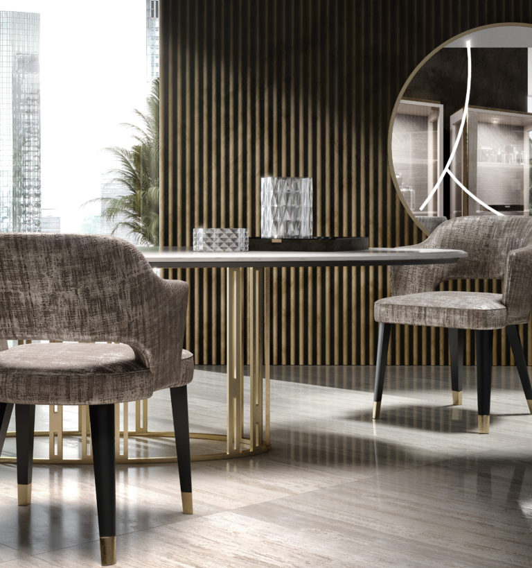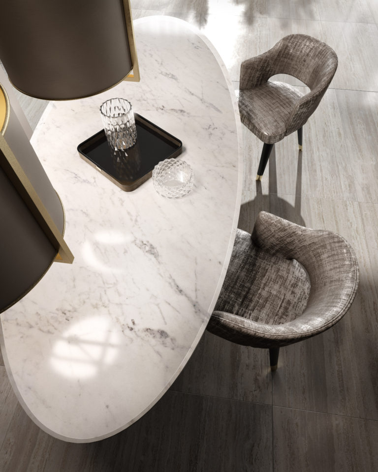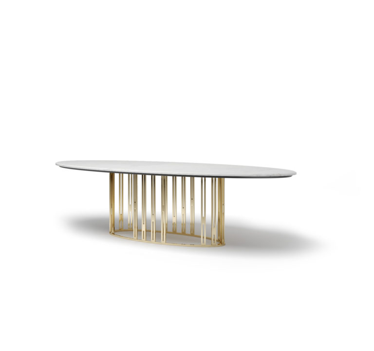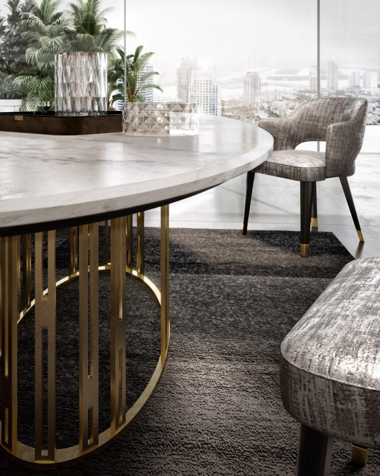 Iron base with warm gold metallic finish. Top in Bianco Gioia Lucido Marble. Customizable (size, color etc).