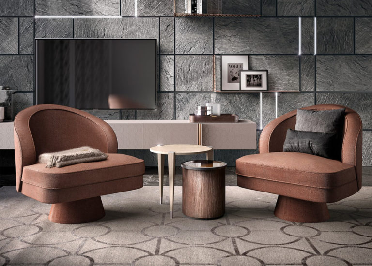 Padded Armchair, upholstered in fabric, faux-leather handle, lacquered fondant brown leg and handrail, grey smoke metallic inserts