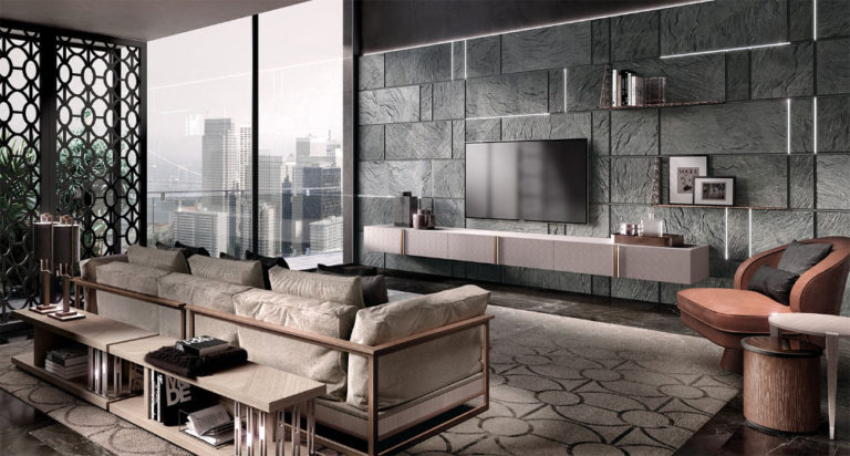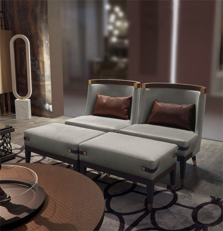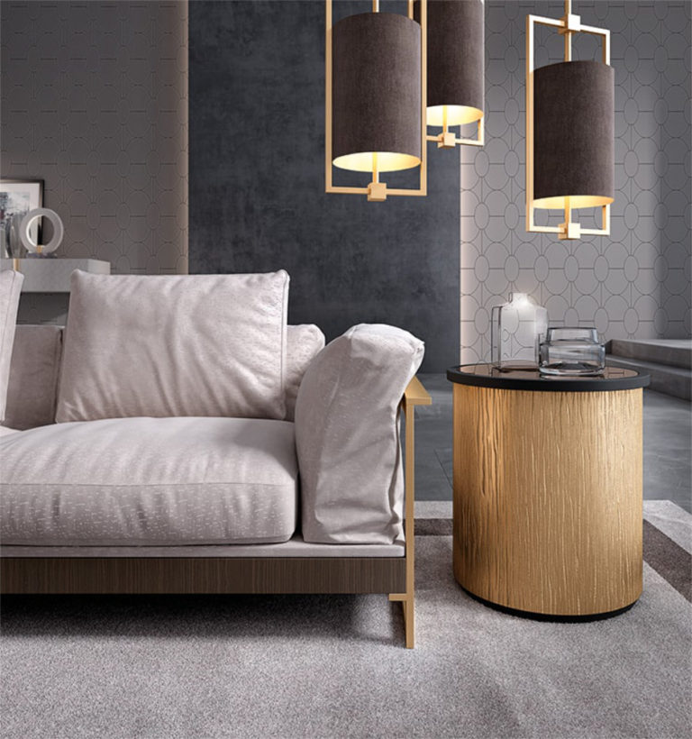 Faux-leather sofa, Oak wood, Extra warm finish, grey smoke metallic inserts.