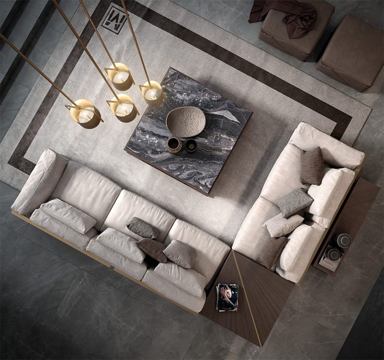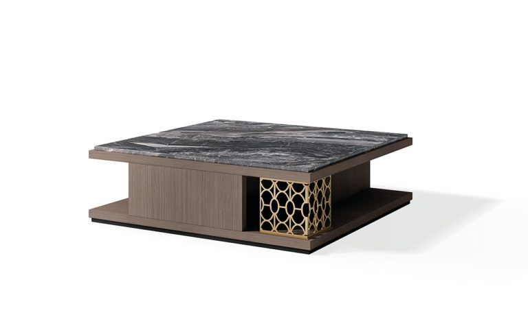 Solid wood structure. Frame in Oak veneer. Marble top. Metallic finish inserts.