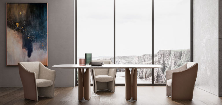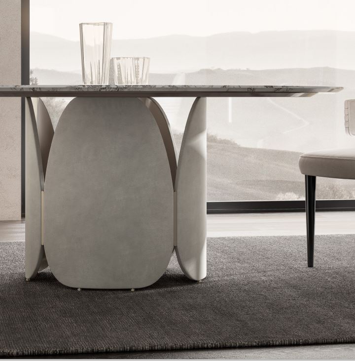 Floor-standing base in curved wood covered in leather or fabric.