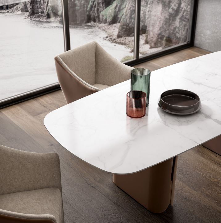 Top in marble or laminam or solid wood/lacquered wood/veneered wood with shaped edge, with wood under-top.