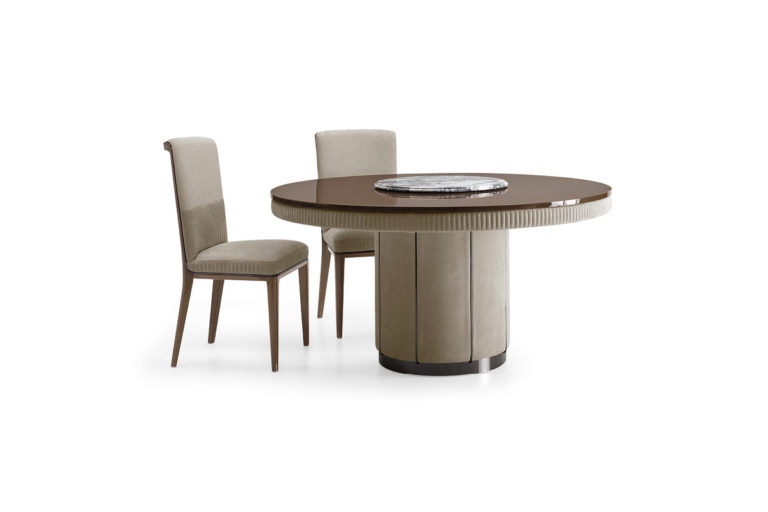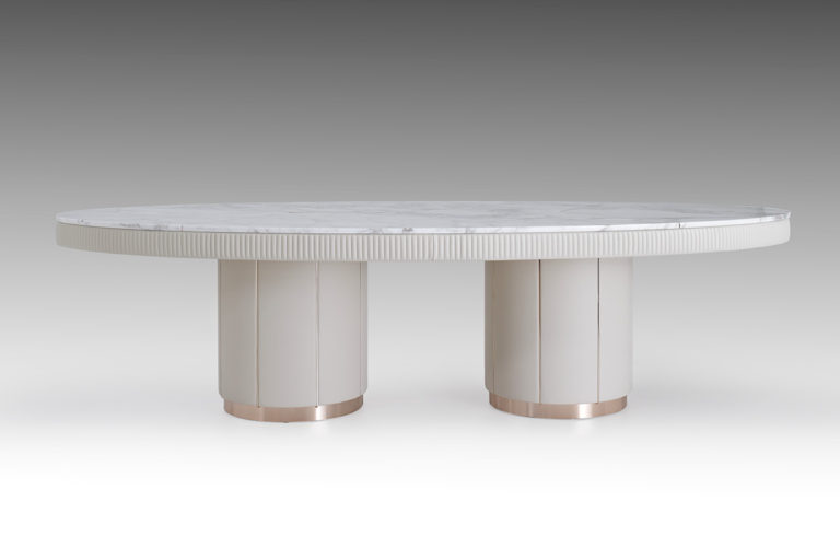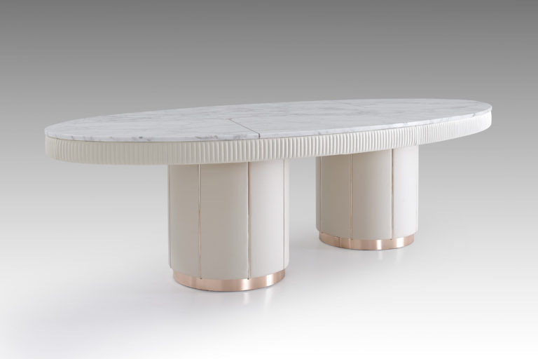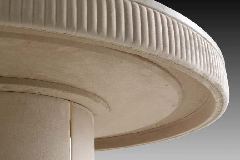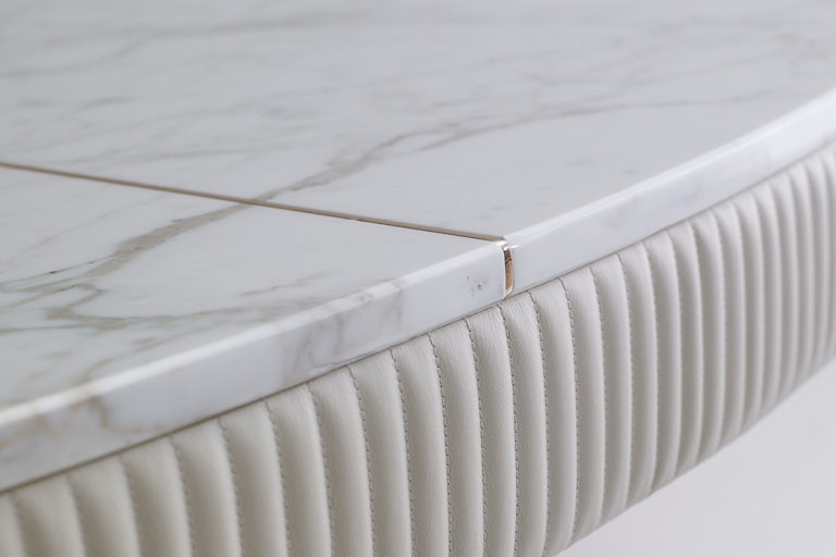 Top in marble or veneered plywood with external strip in fabric or wood.