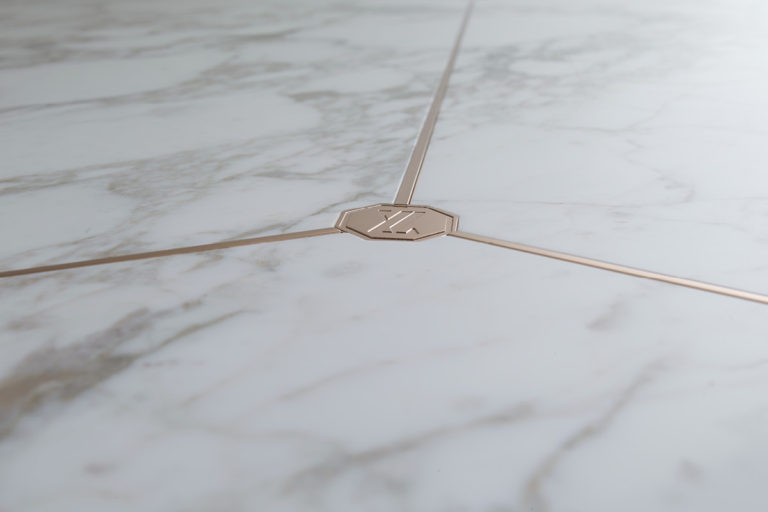 Floor-standing base and vertical inserts in chrome-plated metal.