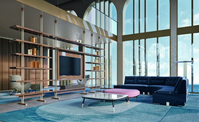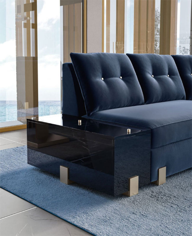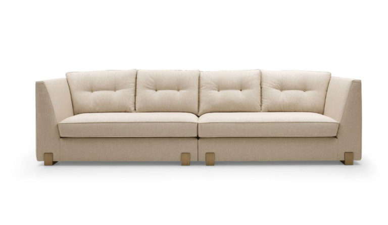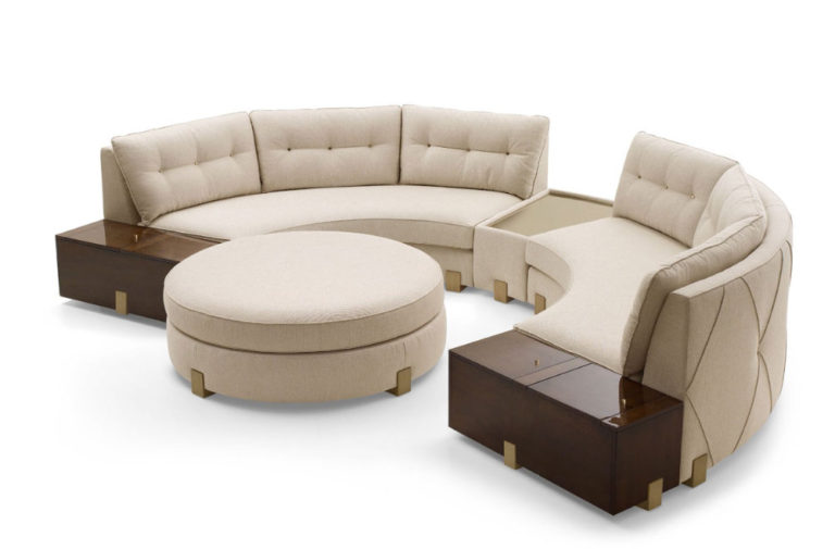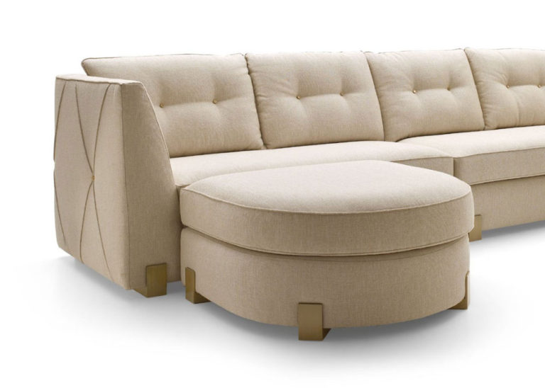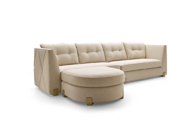 Sectional sofa with plywood frame, fully upholstered in fabric or leather, padding in multi-density foam rubber, upper layer in air soft, covered in lap across the entire surface, outer layer of cushions in 3 cm memory foam, seat with elastic belts, feet in lacquered wood with specific chrome-effect treatment.