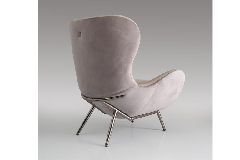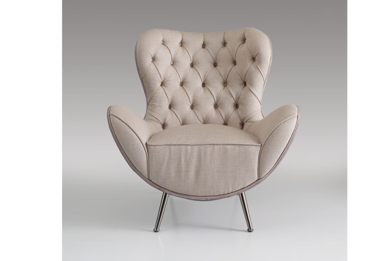 Frame in curved plywood. Capitonne upholstery. Chrome-plated Metal Base, made from an assembly of conical and curved tubes.