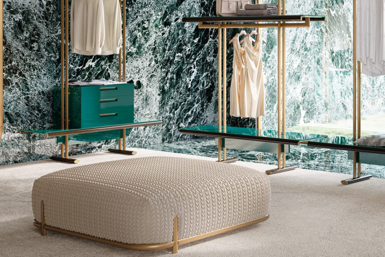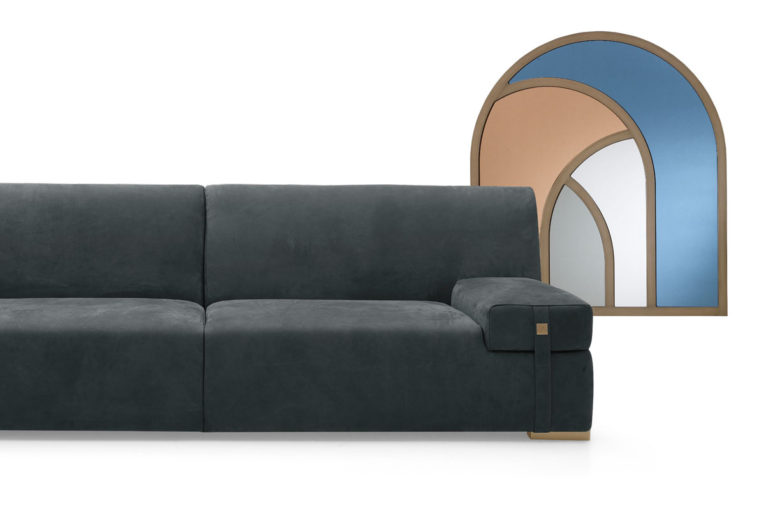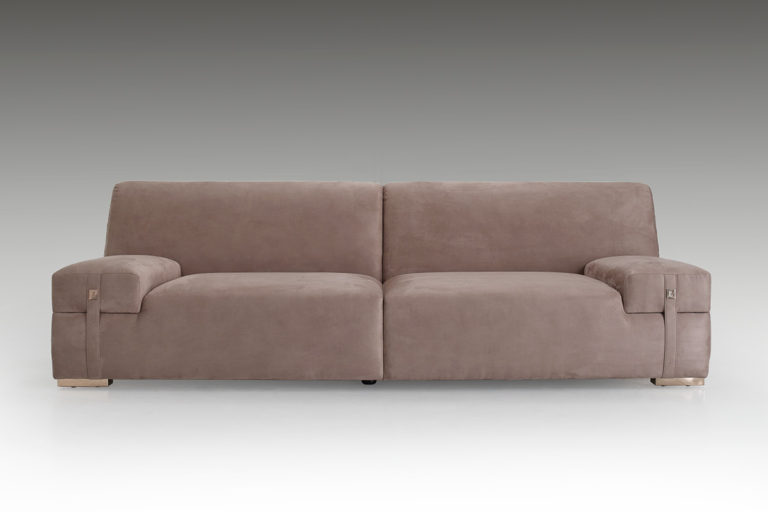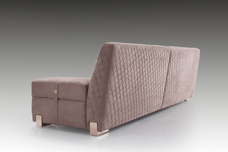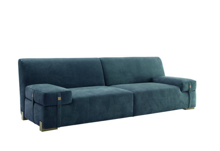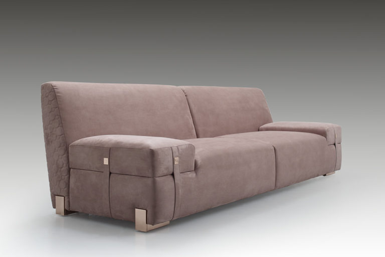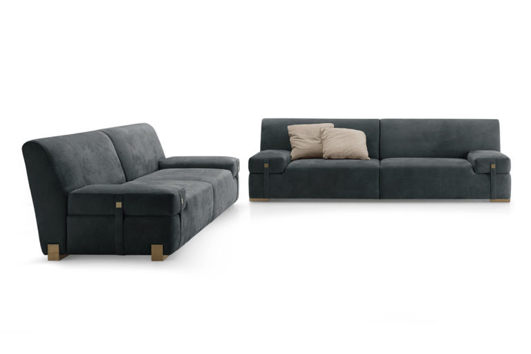 Solid wood and plywood frame, fully upholstered in fabric or leather, seat upholstered in multi-density foam rubber, outer seat cushion layer in 3 cm memory foam, seat with elastic belts, base in lacquered wood with specific chrome-effect treatment.